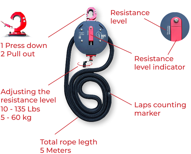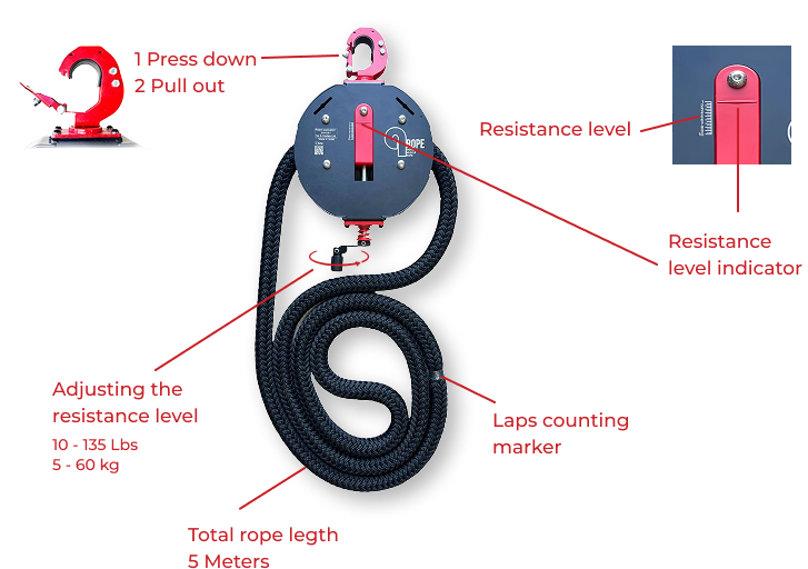 The kit includes the Q-ROPE device itself, a high-quality sports carrying bag that makes it easy to store and transport the device anywhere, a dedicated strap used for both carrying and for hanging and anchoring the device in various locations, as well as an exercise booklet that offers guidance and inspiration for a wide range of workouts.
